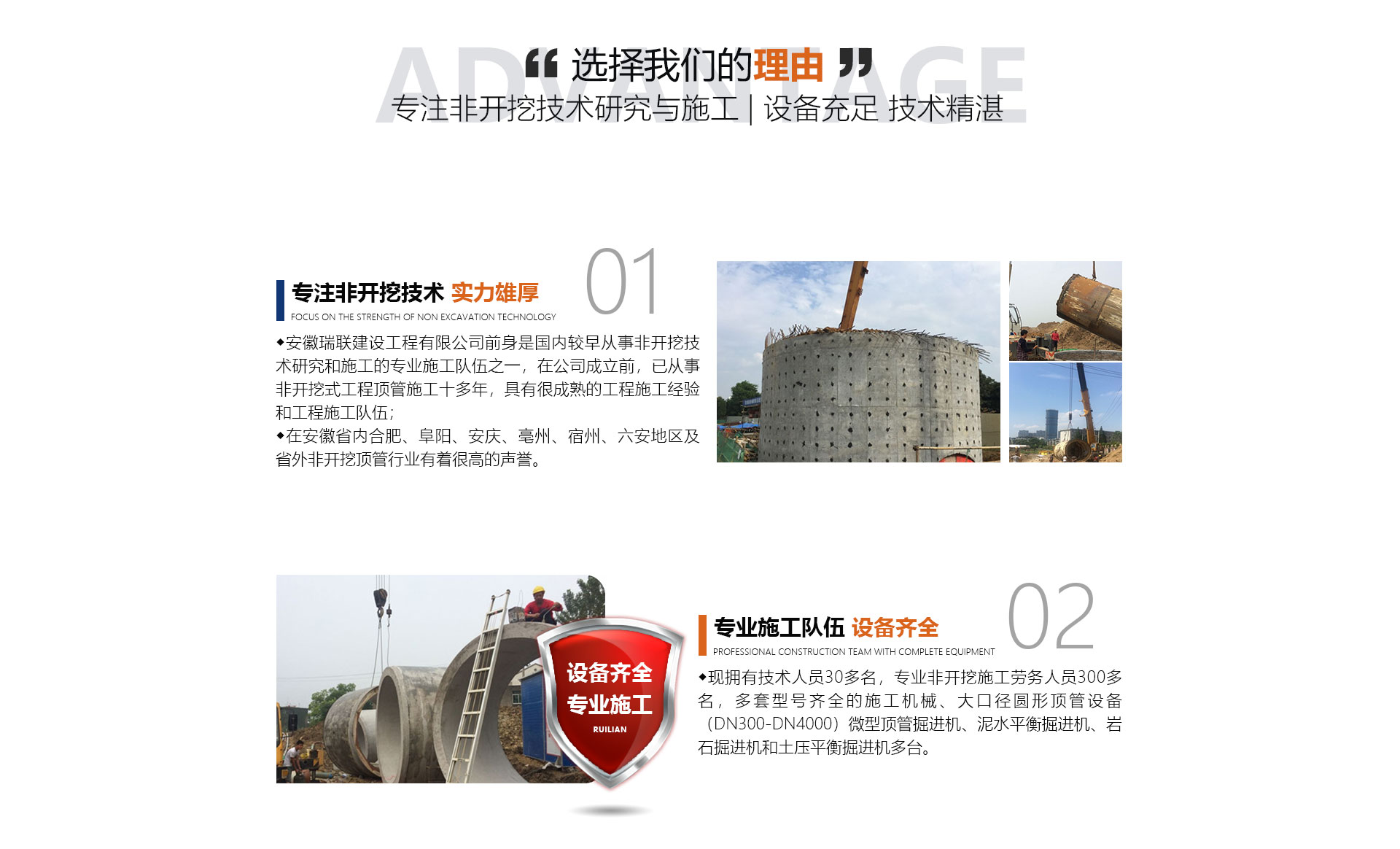 安徽瑞聯(lián)建設(shè)工程有限公司前身是國內(nèi)較早從事非開挖技術(shù)研究和施工的施工隊(duì)伍之一,在公司成立前,已從事非開挖式工程頂管施工十多年,具有很成熟的工程施工經(jīng)驗(yàn)和工程施工隊(duì)伍,在安徽省內(nèi)合肥、阜陽、安慶、亳州、宿州、六安地區(qū)及省外非開挖頂管行業(yè)有著很高的聲譽(yù)。面對(duì)日益擴(kuò)大的市場(chǎng),公司于2014年正式成立,公司擁有勞務(wù)分包及市政公用工程總承包資質(zhì)。公司優(yōu)勢(shì)(文字):現(xiàn)擁有中高技術(shù)人員30多名,非開挖施工勞務(wù)人員300...
